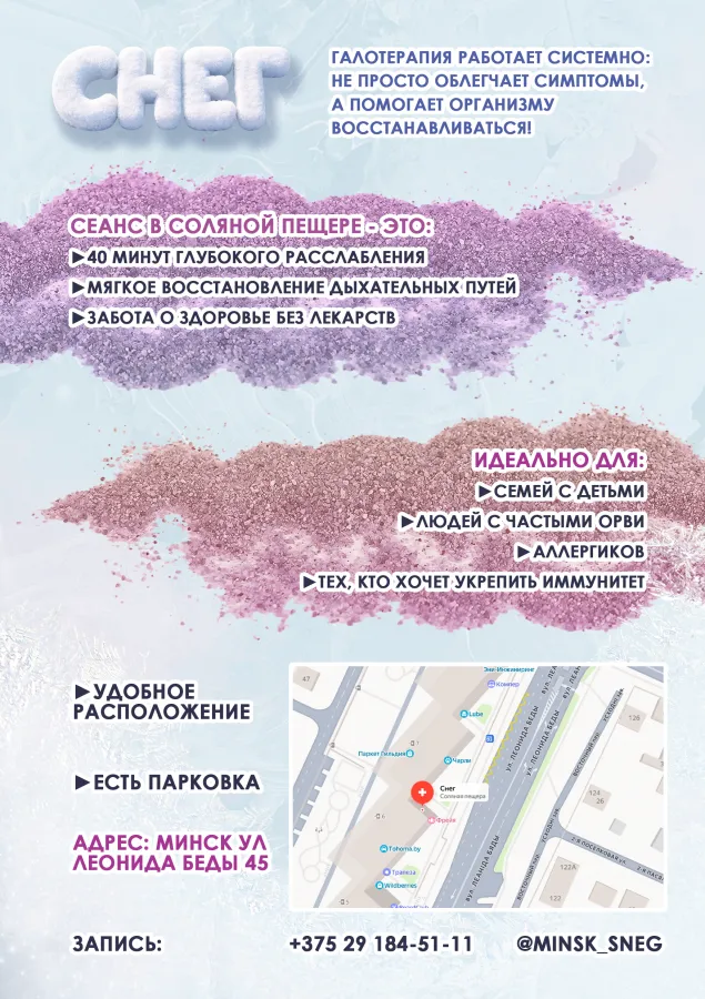 МЕСТО ПРОВЕДЕНИЯ: г. Минск, ул. Леонида Беды, 45, Соляная пещера "Снег"