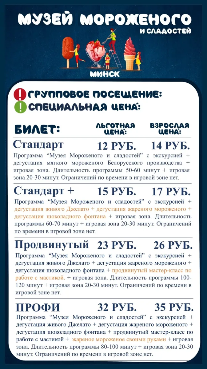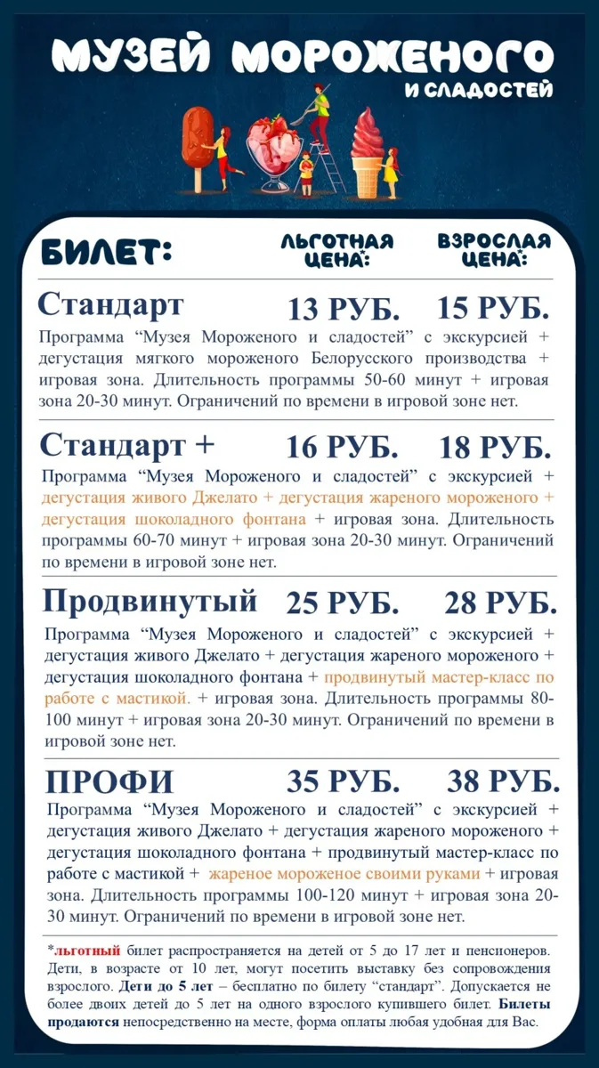 - Что входит в экскурсию: рассказ об истории мороженого, знакомство с процессом его приготовления, дегустации различных видов, доступ к игровой зоне и фотозонам.