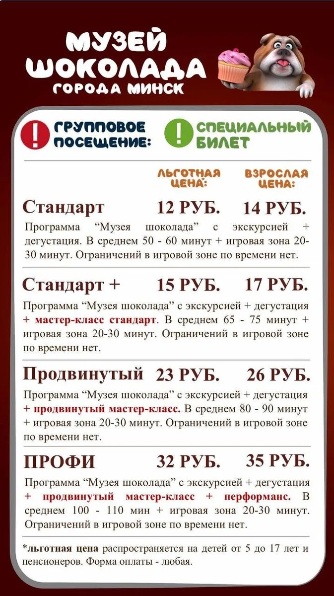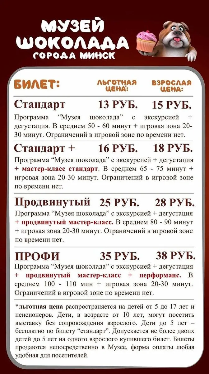 - Что входит в стоимость билета "Стандарт": лаборатория шоколада, просмотр коллекции шоколадных экспонатов, зона интерактивных загадок и фокусов, дегустация различных сортов Бельгийского шоколада, игровая зона, фотозона, пазлы, раскраски, головоломки, интерактивная экскурсия с гидом.