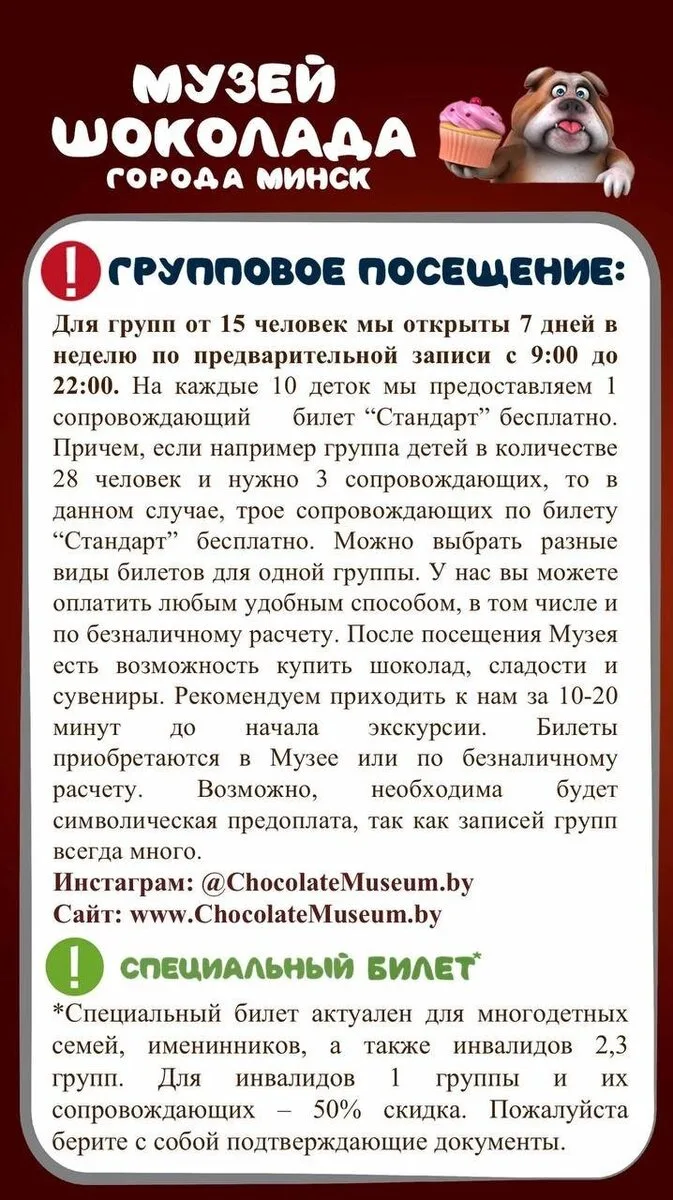 "Музей шоколада города Минск" - уникальный образовательно-развлекательный проект, посвященный шоколаду. Проект раскрывает огромный потенциал шоколада как бесконечного источника вкуса, развлечения, вдохновения и познания. Шоколадные экспонаты и композиции, лаборатория шоколада, специальные игровые и интерактивные зоны, дегустация Бельгийского шоколада, перформансы и мастер-классы, фотозона и игровая зона скорее всего удивят даже самых требовательных гостей. Посетители проекта "Музей шоколада "Шоколандия" - это не только дети, более 38% посетителей проекта - взрослые. Концепция проекта означает полное погружение в мир шоколада.