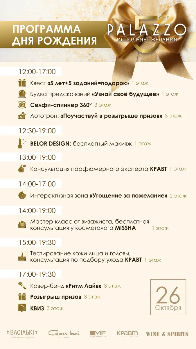 «В честь нашего дня рождения мы организовали масштабное событие с множеством интересных активностей и сюрпризов для гостей. Например, квест, где участники за выполнение заданий получают подарки – это как сувениры от арендаторов, так и сертификаты на покупки в магазинах ТРЦ. Кроме того, 26 октября будет проходить лотерея с ценными призами. Мы надеемся, что это мероприятие укрепит связь с нашими посетителями. Мы ценим каждого нашего посетителя и стараемся создать для максимум комфорта и радости», – рассказывает представитель ТРЦ Palazzo.