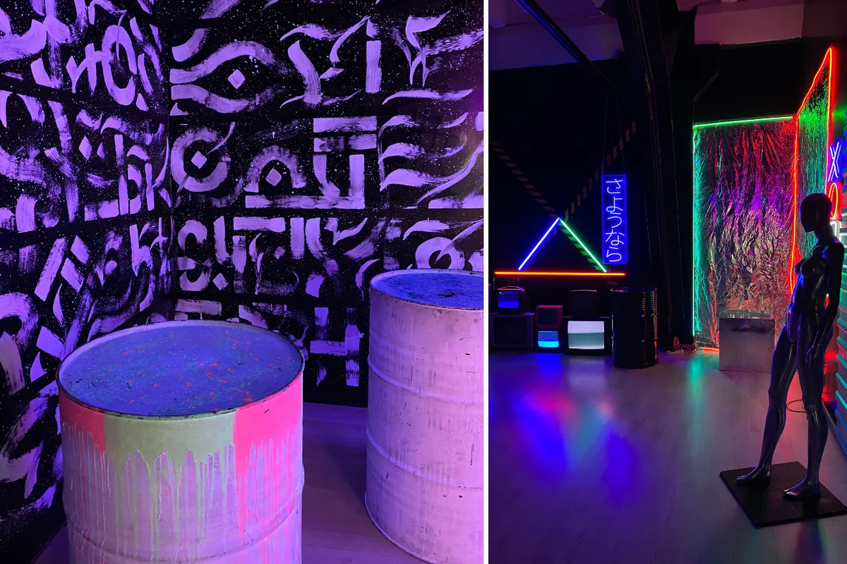 Второй зал «Неон» более концептуальный - яркий и необычный, и больше подойдет для подростковой фотосессии. Зал состоит из нескольких фотозон: большой угол с граффити от известного художника, телевизоры, которые светятся разными цветами, серебряный угол с разноцветной подсветкой и серебряным кубом. В стоимость зала входят все неоновые вывески, три неоновые ленты, которые можно перемещать по залу, неоновый автомат, большая горизонтальная лампа, которая может менять свет. В стоимость зала не входят источники света (постоянные или импульсные), они оплачиваются отдельно.