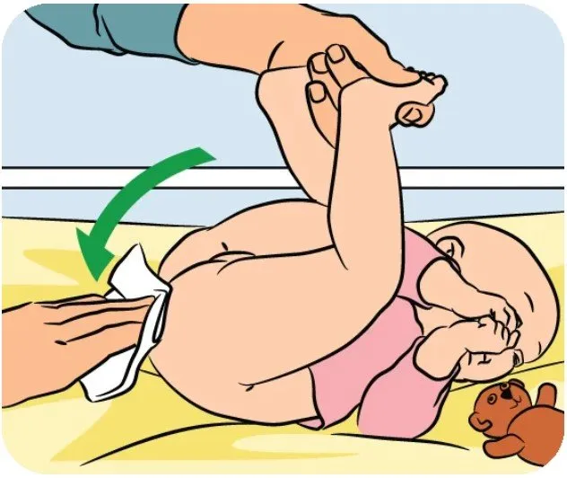 1. Аккуратно очистите кожу ребенка, используя детские салфетки и теплую воду.