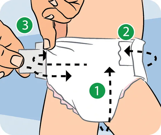 1. Расправьте подгузник и поднимите внутренние защитные оборочки. Поднимите ребенка за лодыжки и положите подгузник так, чтобы его задняя часть была немного выше уровня пупка ребенка. Передняя часть подгузника должна закрывать пупок ребенка. Придерживая подгузник, аккуратно застегните липучки. Расправьте защитные оборочки вокруг ножек, чтобы предотвратить протекание. Готово!В случае, если пупок вашего ребенка воспален, закройте его марлевым тампоном.