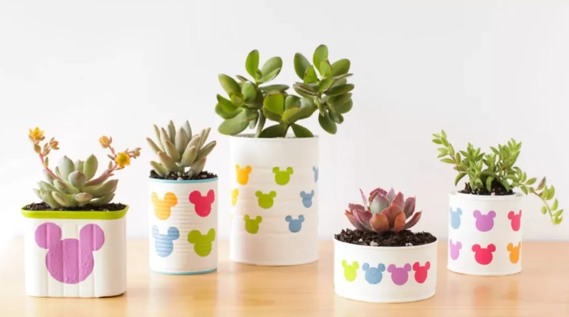 Цветы и всевозможная зелень будут прекрасно расти в этих цветных горшочках. Особенно подойдут суккуленты, так как они неприхотливы в уходе и не требуют много воды. Проявите творческий подход - используйте множество банок разных форм и размеров и добавьте несколько красочных фигур "Микки Мауса" для по-настоящему волшебного вида!