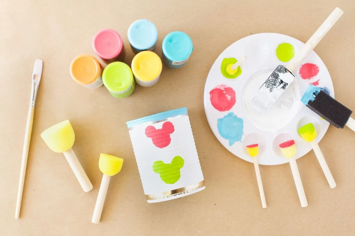 4. С помощью поролоновых спонжей для рисования и разноцветных красок нанесите мордочки и уши "Микки" на жестяные банки. Дайте краске полностью высохнуть. При необходимости используйте небольшую кисть, смоченную белой краской, чтобы «стереть» любые ошибки, сделанные с помощью цветных красок.