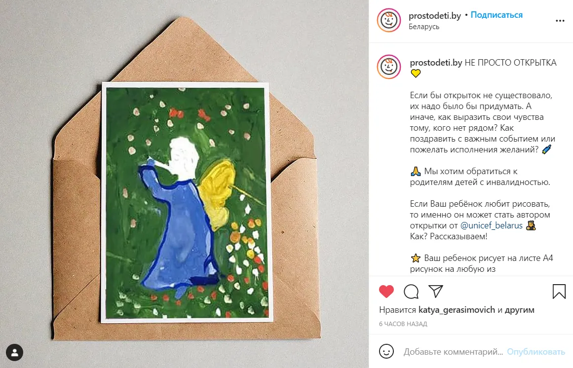 Скриншот из Instagram @prostodeti.byЕсли Ваш ребёнок любит рисовать, то именно он может стать автором открытки от @unicef_belarus.