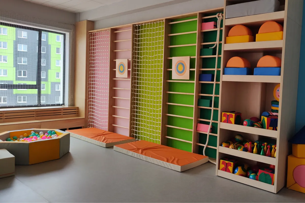 Конечно же в детском саду имеются спортивный и музыкальный залы. В спортзале оборудованы кольца на стене, небольшой скалодром и шведская стенка, а музыкальный зал с мягкими креслами может использоваться для утренников.