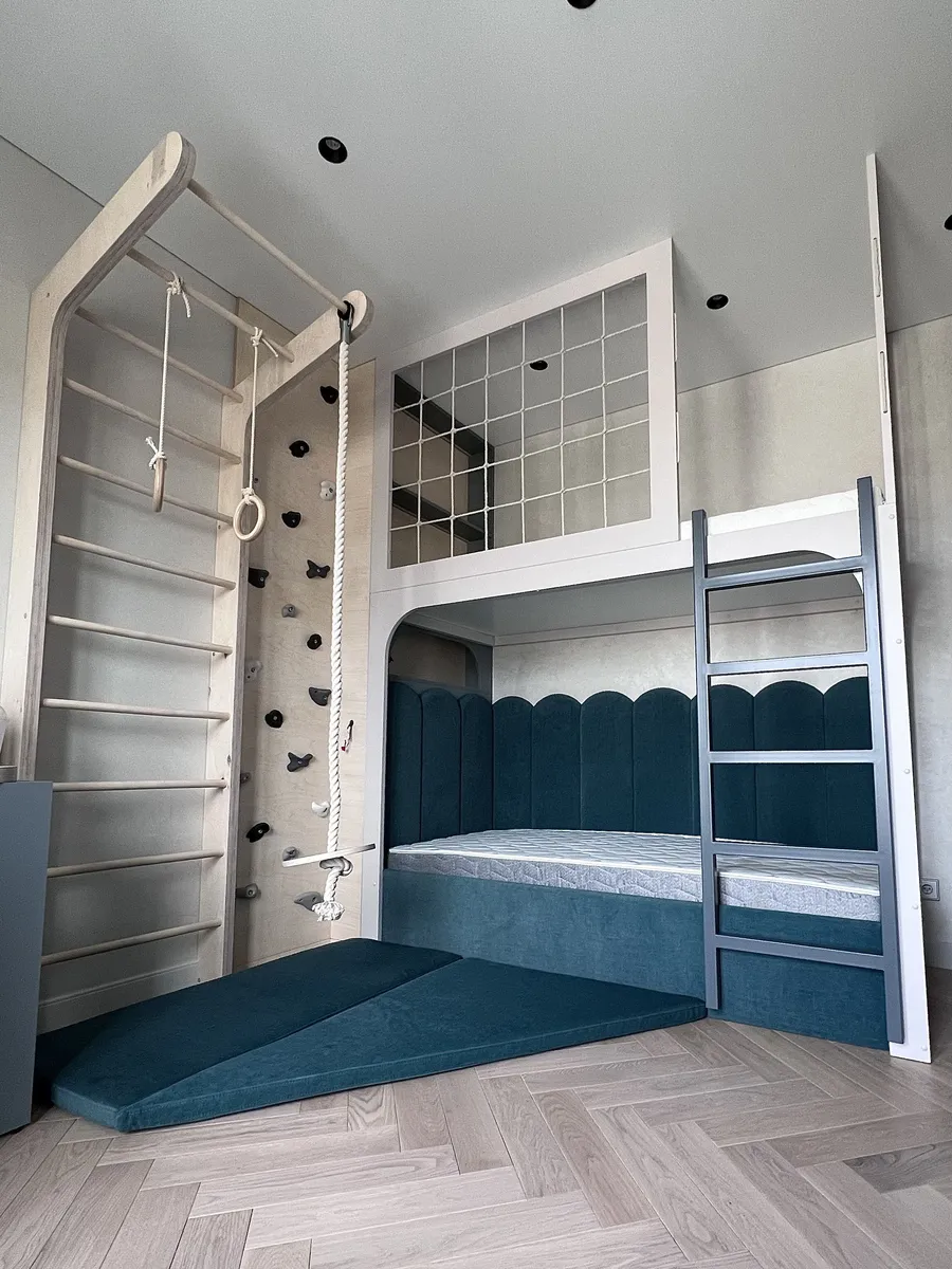 - Бонус: Это, пожалуй, единственное место в подборке, где к кровати можно сразу докупить шведскую стенку. Идеальное комбо: выспался — и сразу на турник.
