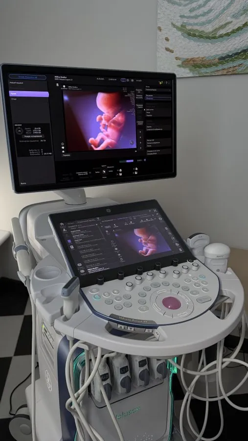 Скрининги проводятся на аппарате экспертного класса Voluson E8. Это «золотой стандарт» пренатальной диагностики, который позволяет проводить детальное 2D, 3D и 4D исследование. Высокое разрешение дает возможность врачам рассмотреть мельчайшие анатомические структуры плода уже на ранних сроках. Главная «фишка» для родителей — режим реального времени (4D), когда можно увидеть не просто фото, а мимику малыша, и записать это первое видео на USB-флеш-накопитель.