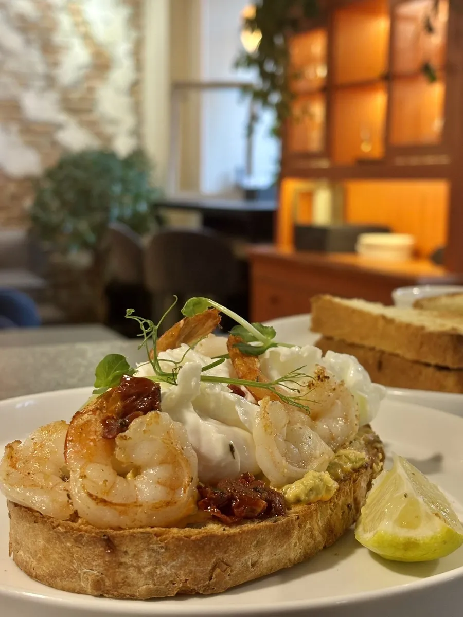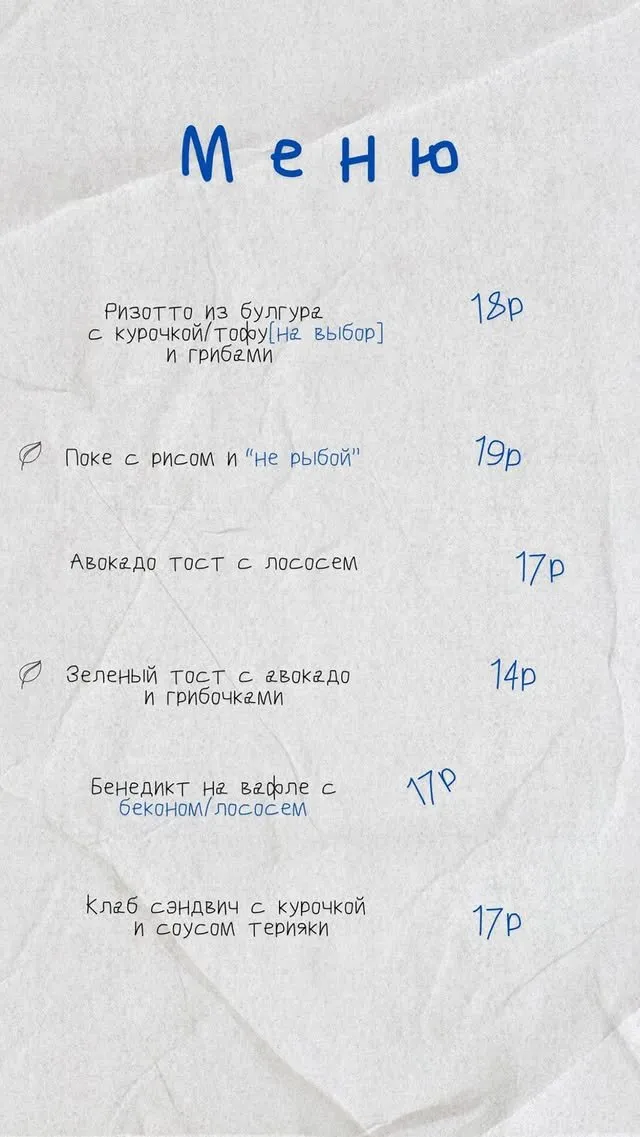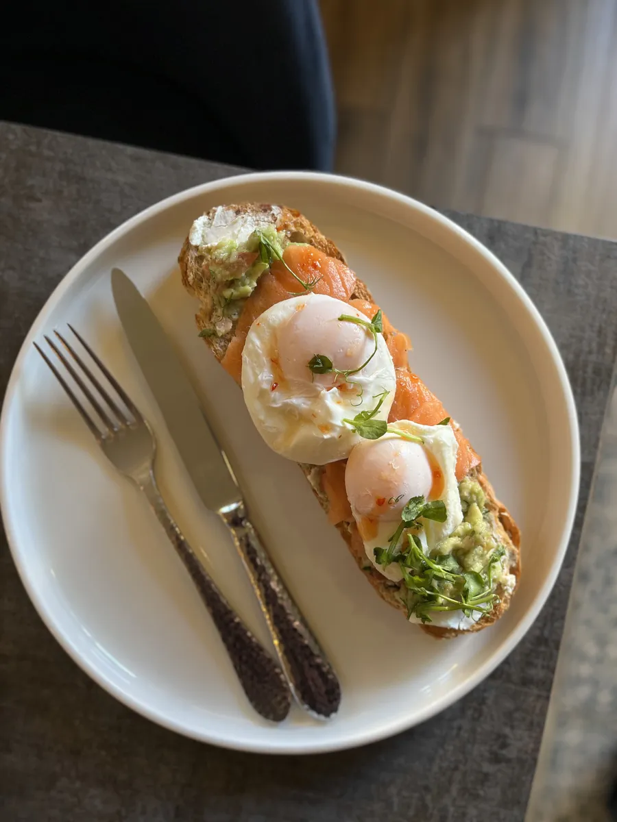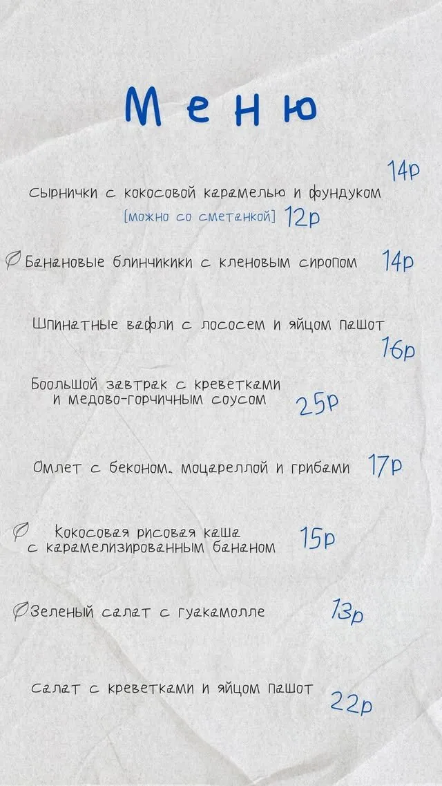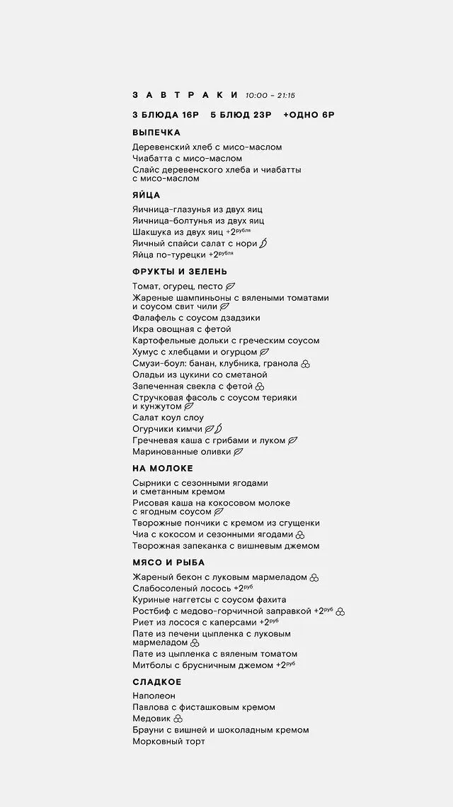 В меню — завтраки на любой вкус и ритм жизни. Кто-то выберет классику: французский или английский завтрак, нежные сырники или черничные оладьи с соусом из сгущёнки. А кто-то решит начать день с боула с киноа и яйцом пашот, тоста с лососем и авокадо, омлета с курицей и артишоками или пряной шакшуки. Здесь подают яйцо Бенедикт с малосольным лососем и готовят овсянку на кокосовом молоке с ягодами — для тех, кто ищет баланс вкуса и пользы.