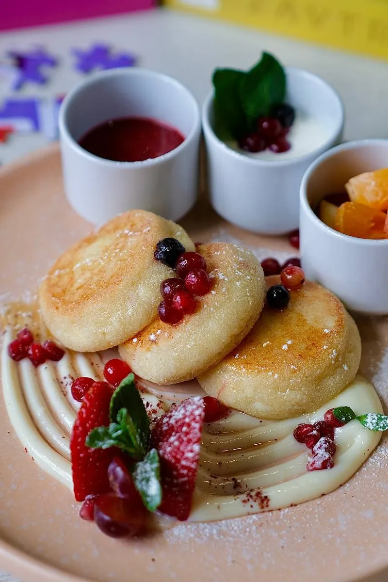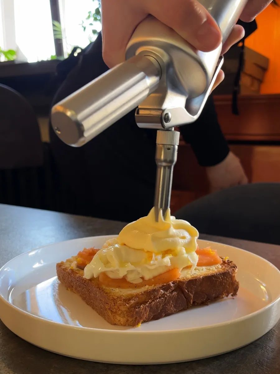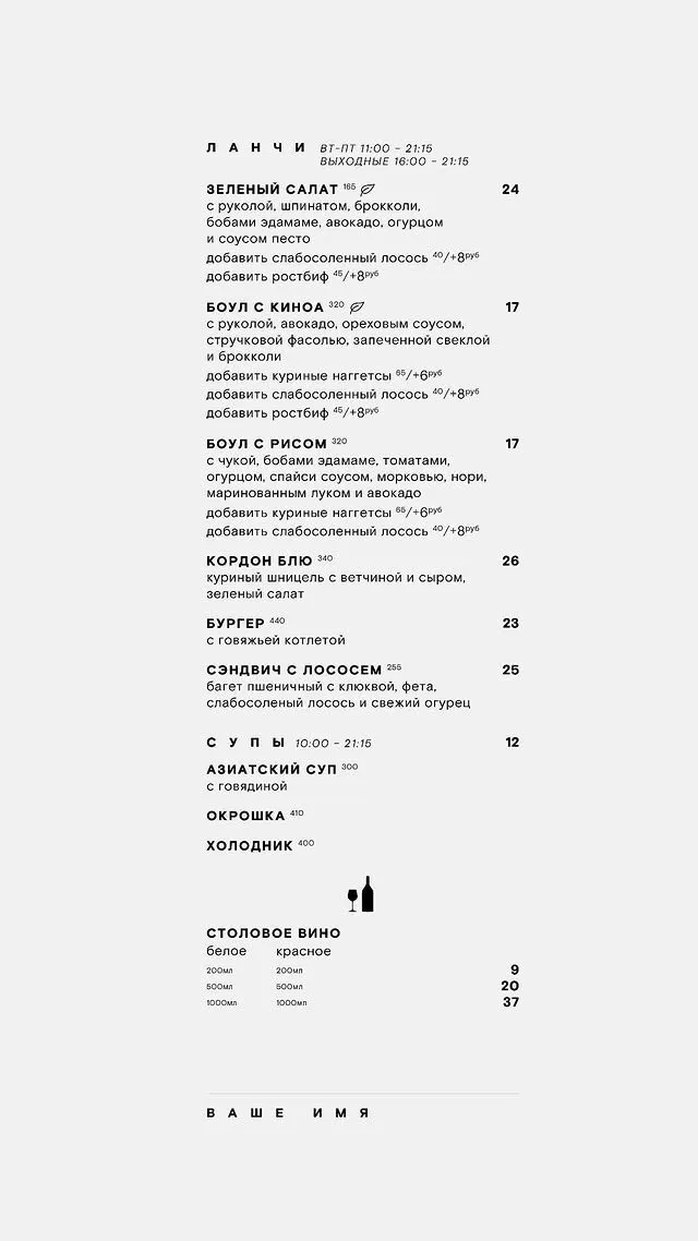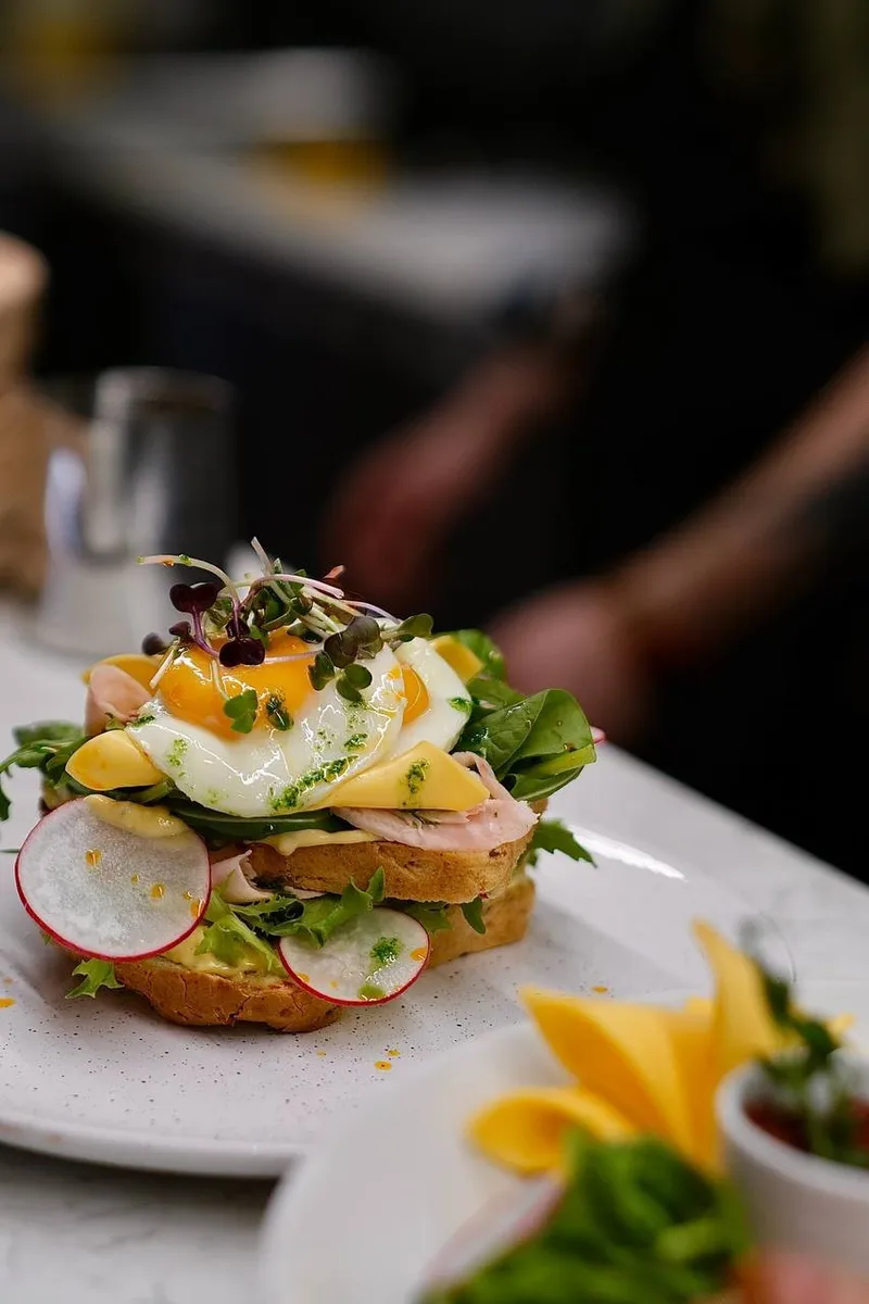 В меню — завтраки на любой вкус и ритм жизни. Кто-то выберет классику: французский или английский завтрак, нежные сырники или черничные оладьи с соусом из сгущёнки. А кто-то решит начать день с боула с киноа и яйцом пашот, тоста с лососем и авокадо, омлета с курицей и артишоками или пряной шакшуки. Здесь подают яйцо Бенедикт с малосольным лососем и готовят овсянку на кокосовом молоке с ягодами — для тех, кто ищет баланс вкуса и пользы.