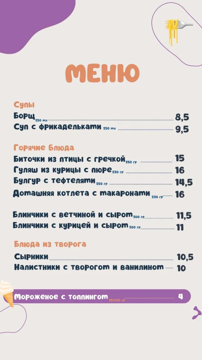 А ещё здесь очень вкусно! Меню радует как детей, так и взрослых: пышные сырники, нежные налистники, домашние котлеты и тефтели, освежающие лимонады и смузи, а на десерт — мороженое собственного приготовления и домашняя выпечка. Все блюда готовятся из свежих продуктов, без лишней химии — с заботой, как дома.