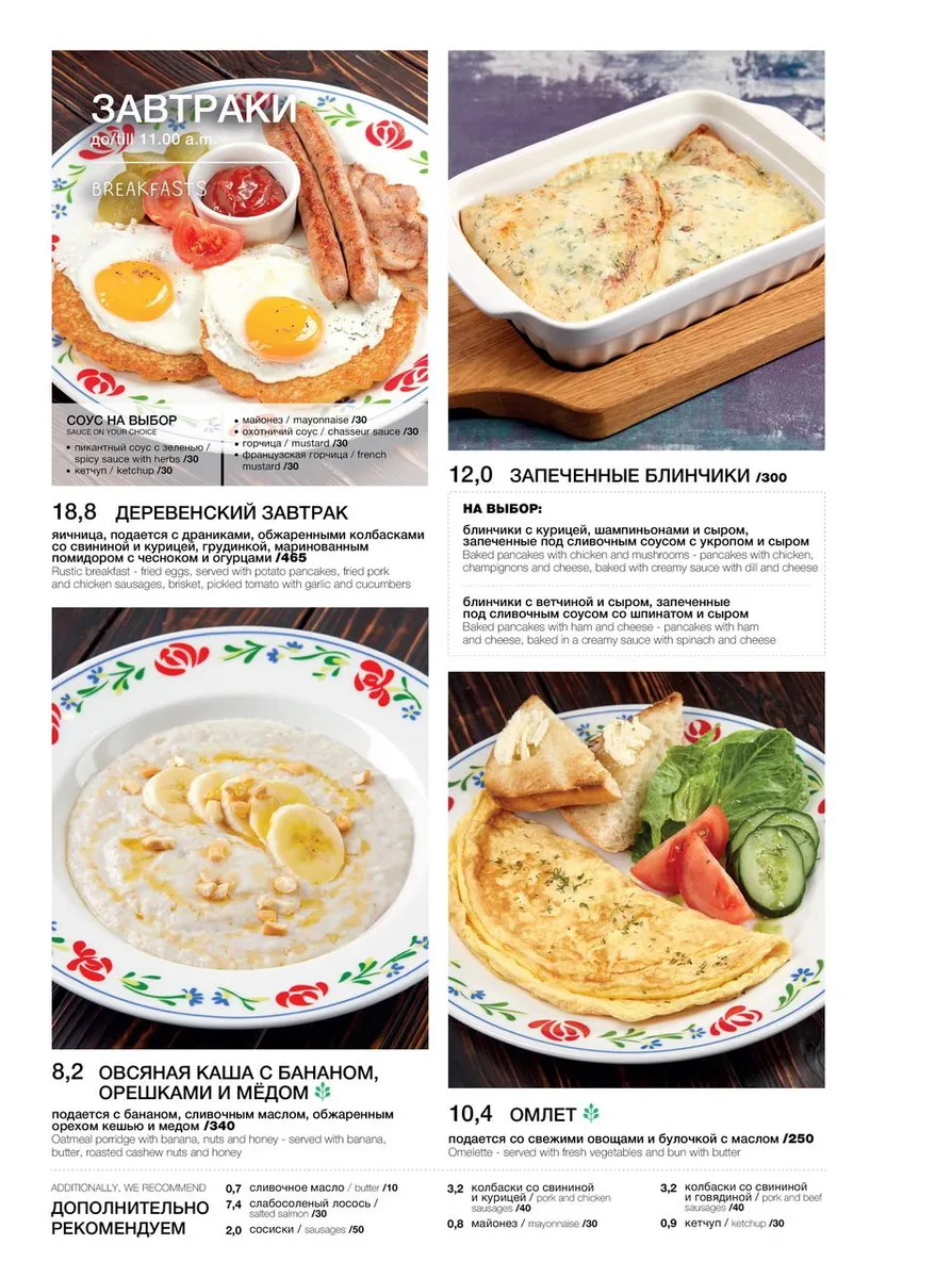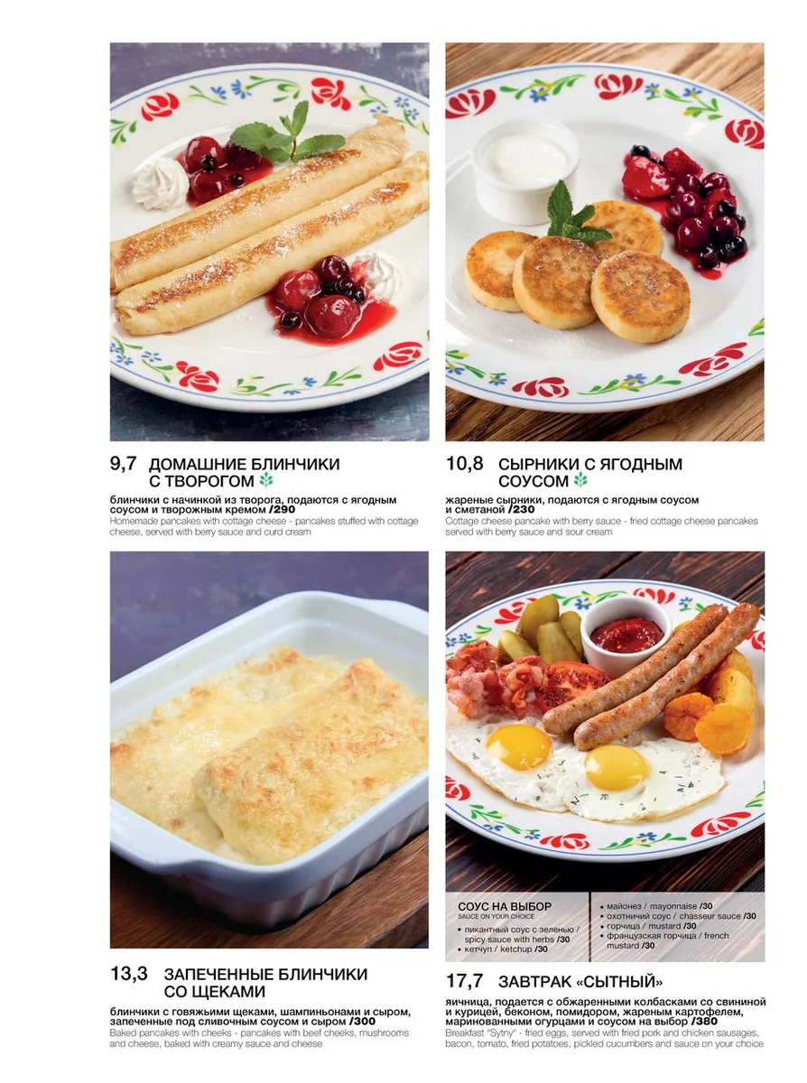 Завтраки здесь — как воскресное утро в деревне: яичница с хрустящей грудинкой, горячие драники, румяные колбаски, маринованные овощи с чесноком и теплом заботы. Хочется чего-то более нежного? Попробуйте овсянку с бананом, мёдом и орешками или пышный омлет. А для сладкого начала дня — классические сырники с ягодным соусом или блинчики с творогом.