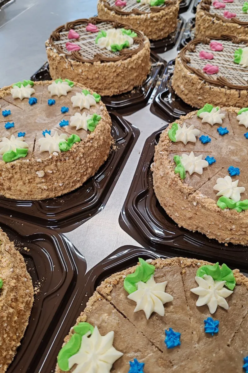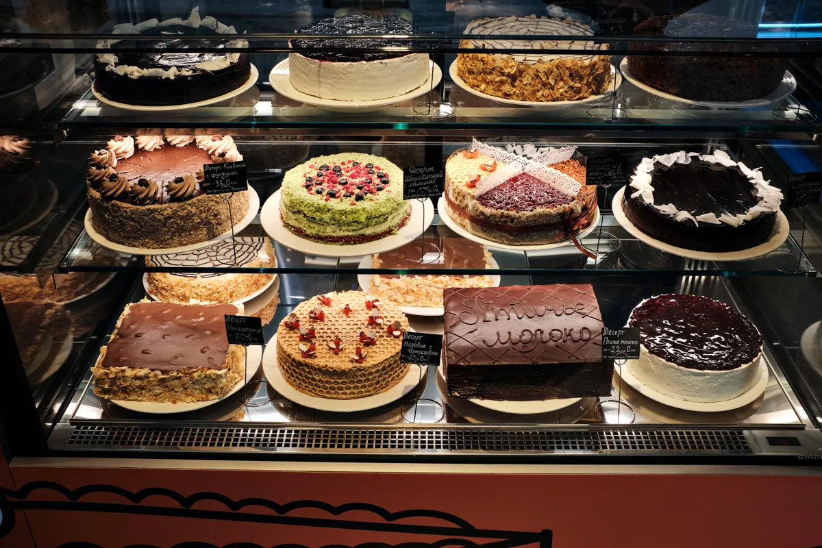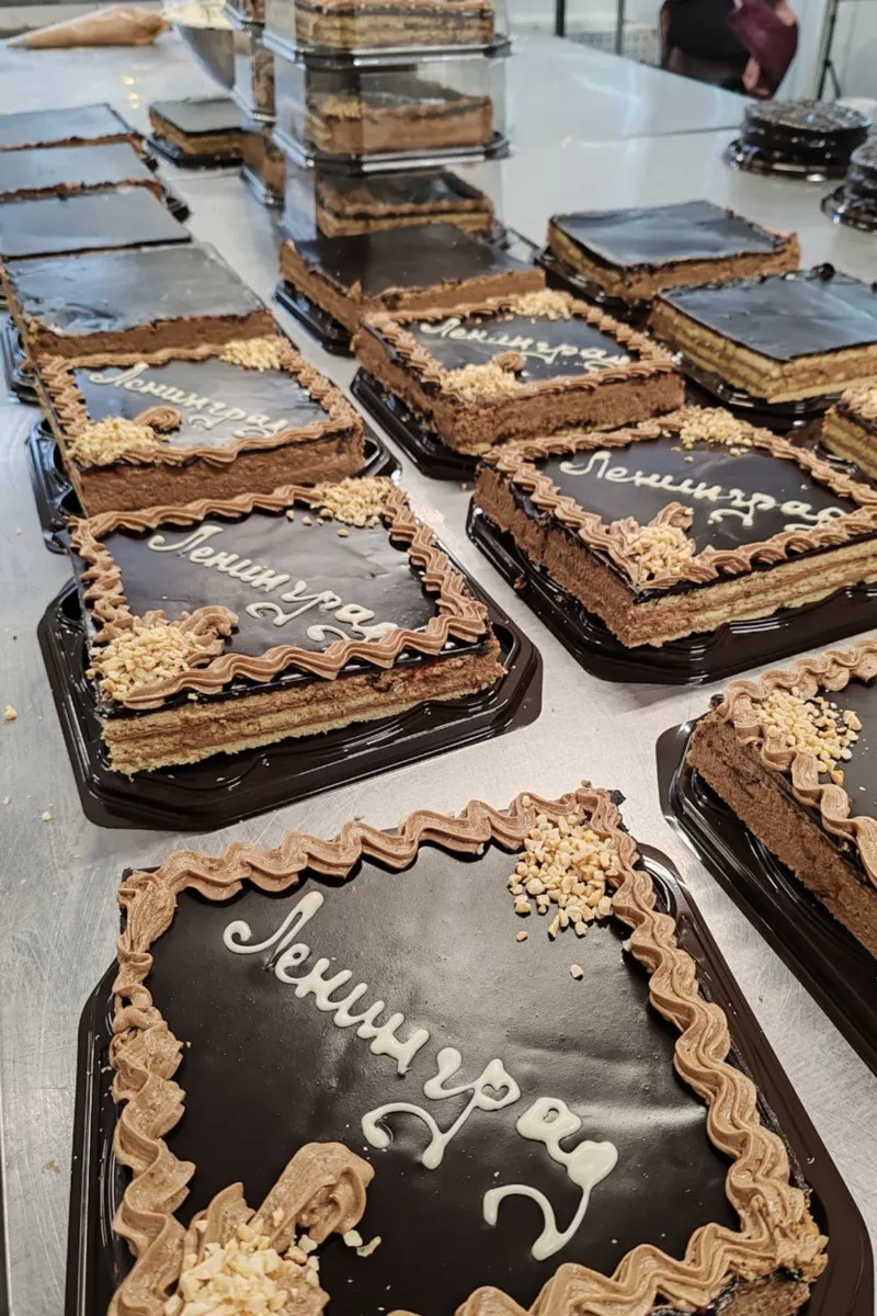 В витринах сети кондитерских магазинов всегда можно найти торты весом 1 кг — от классики советских времен до современных вкусовых решений. Их можно приобрести без предзаказа, а для особого штриха добавить шоколадную надпись при заказе за три дня.