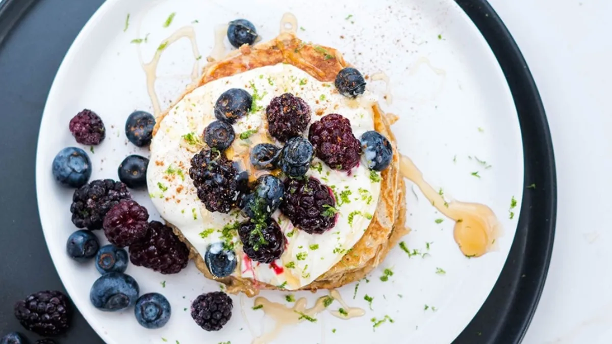 Добавьте к панкейкам ложку натурального йогурта, ягоды и цедру лайма.