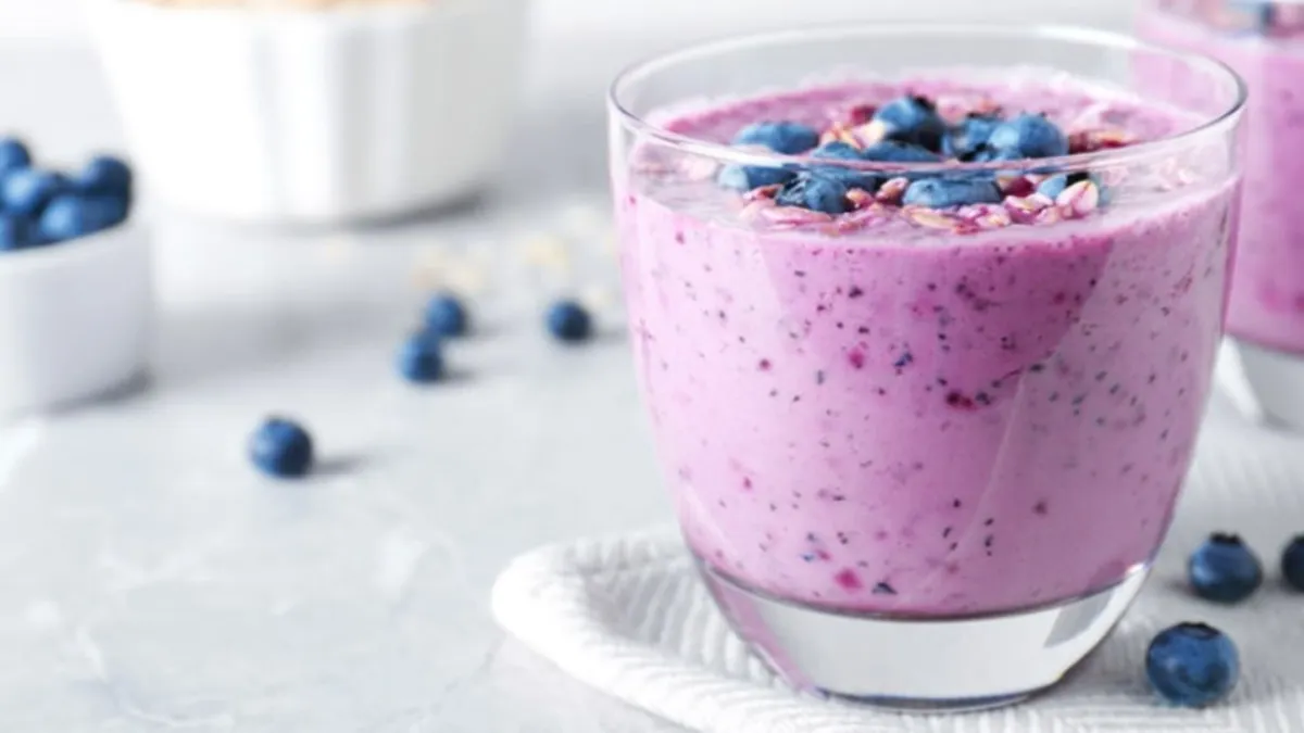 Можете приготовить смузи из: 1/2 чашки черники (свежей или замороженной), 2 ст. ложек овсяных хлопьев, 1 финика, 1 ст. ложки ванильного протеинового порошка, 1 ст. ложки кунжутной пасты, 1 чашки миндального молока (без сахара).
