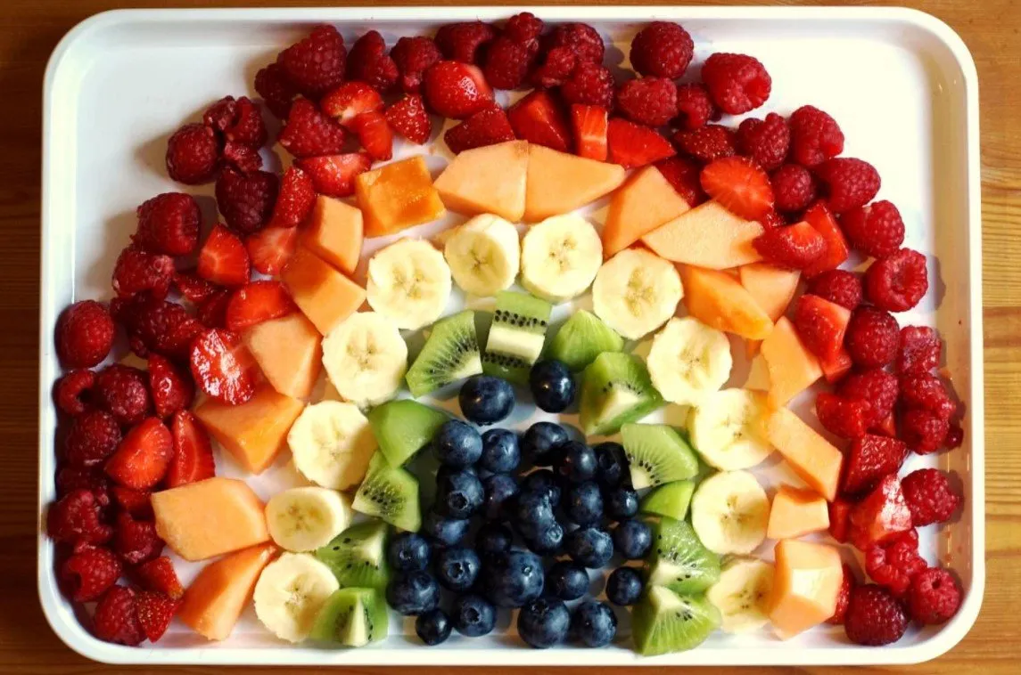 1. Сделайте фруктовую радугу, используя клубнику, ананас, арбуз, киви, красный виноград, апельсины или арбуз и чернику. Предложите детям попробовать каждый фрукт из радуги.