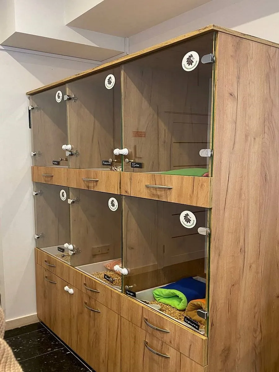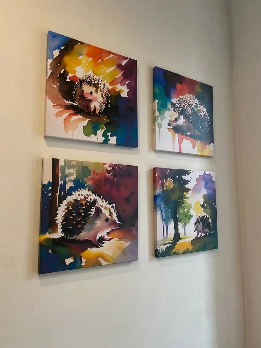 Выглядит ежиный домик довольно уютно. Чисто и светло, много картин на ежиную тематику, много столов и диванчиков со специальными коробочками, назовем их так, куда можно приносить ежика из его домика и немного провести с каждым из них время.