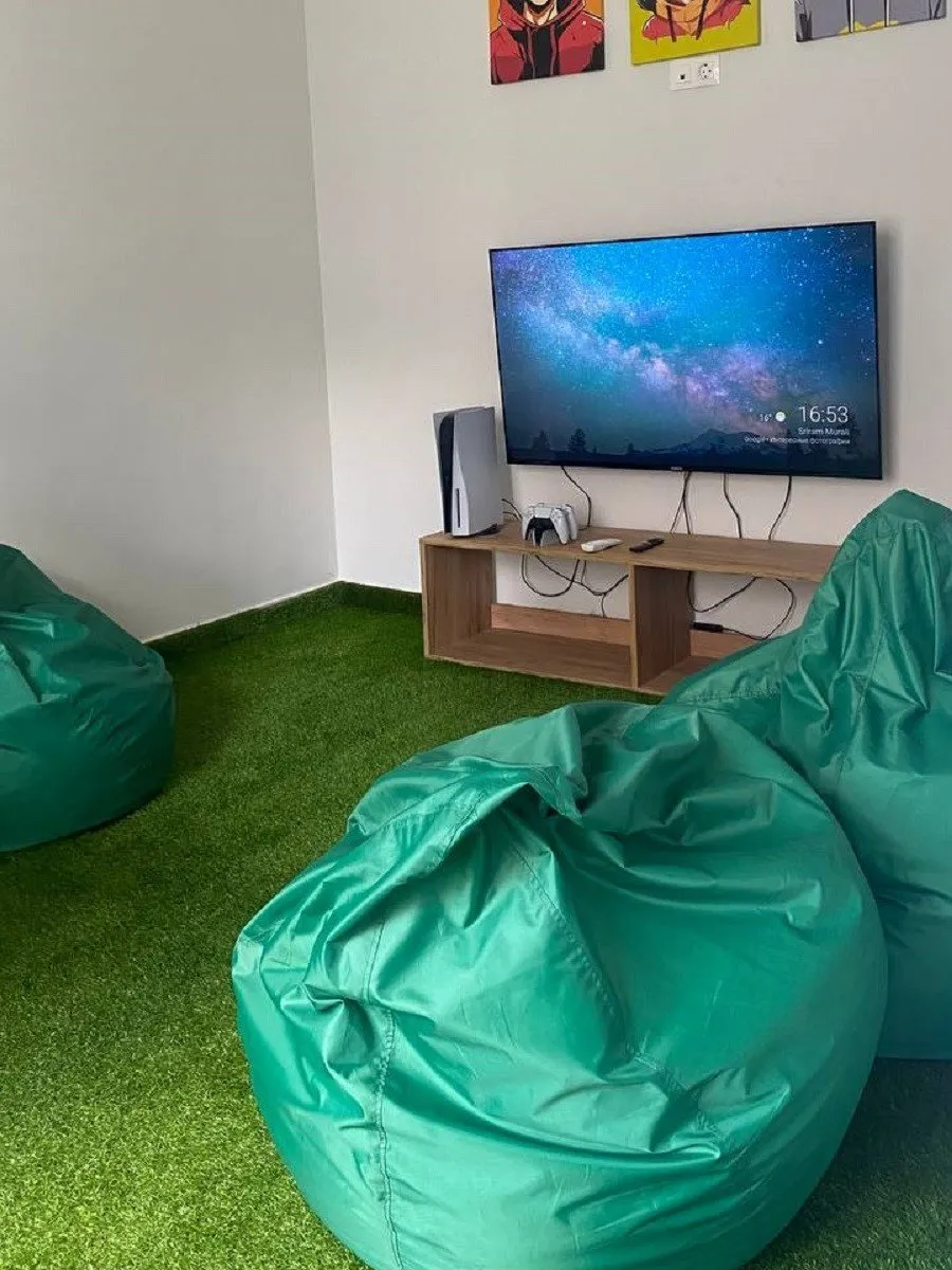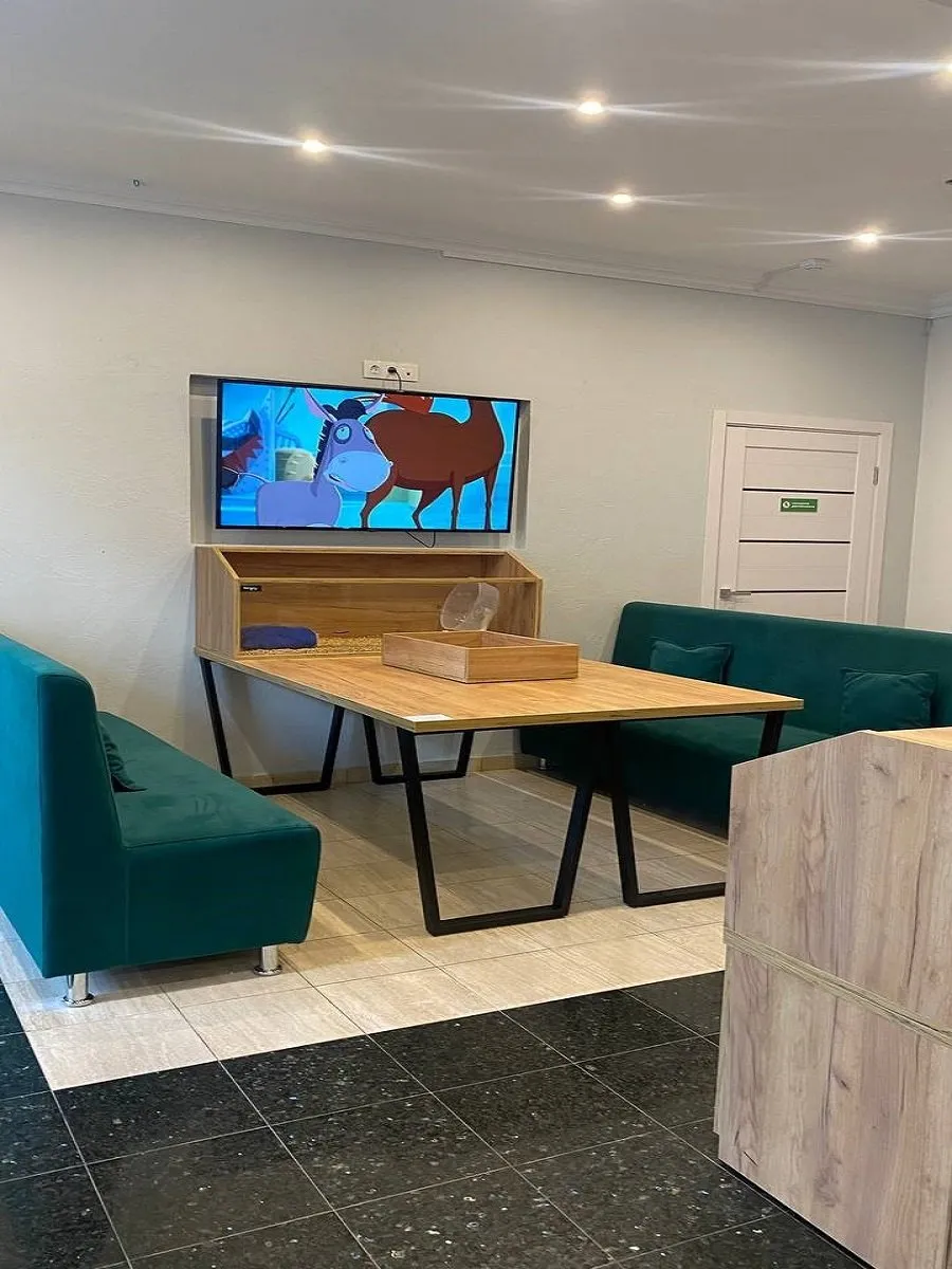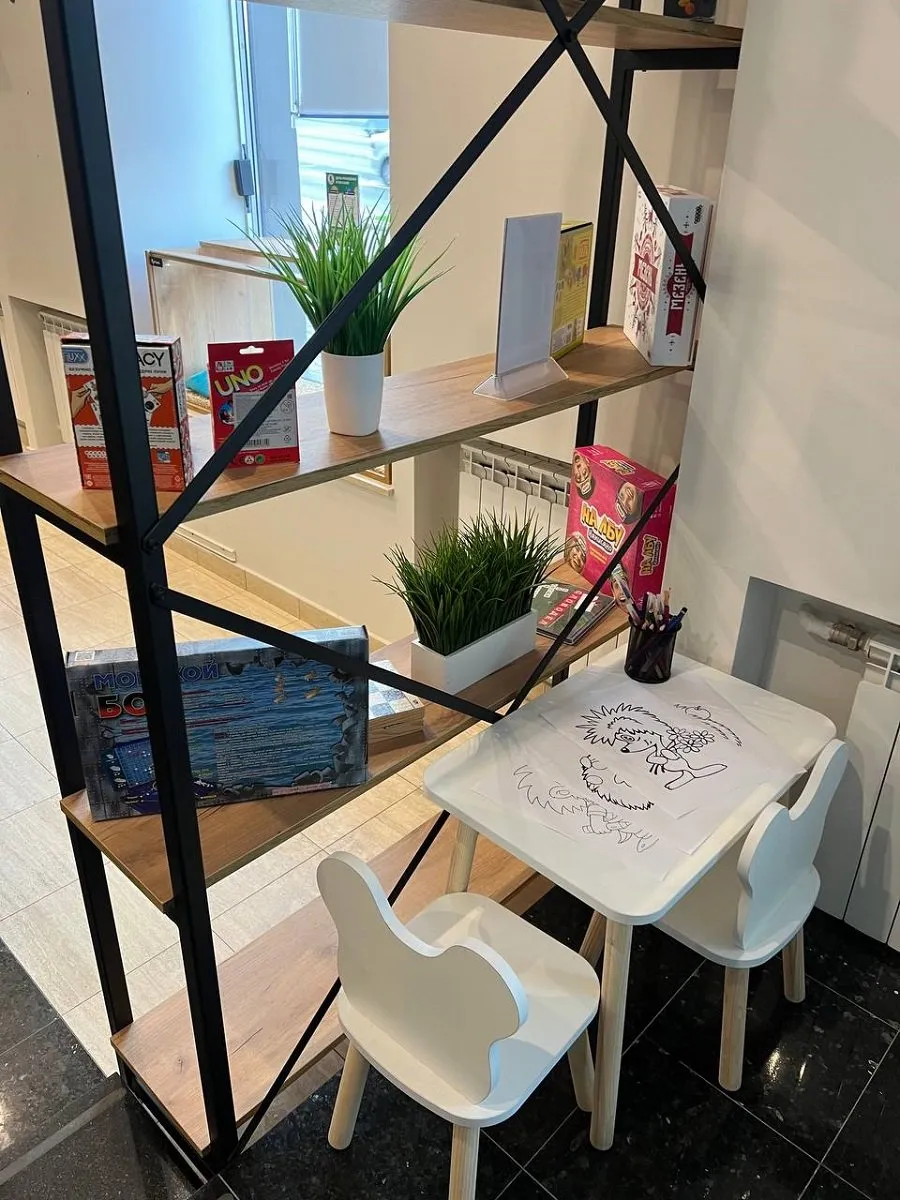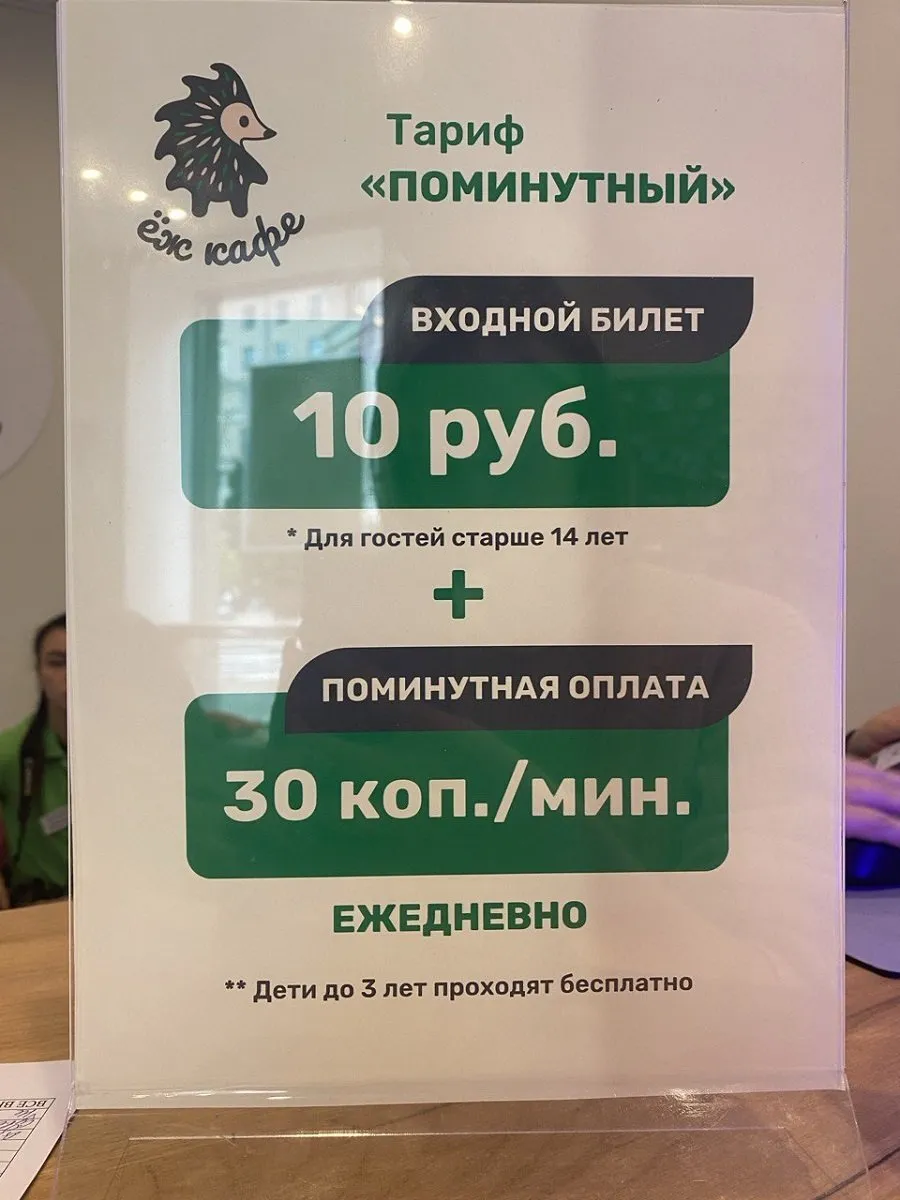 Кроме того есть большой стол и телевизор с мультиками, маленький стол и стул с раскрасками для рисования, настольные игры и детская комната с приставкой и настольным футболом. Около стойки администратора можно поиграть в платную беспроигрышную лотерею, купить сувениры или получить наклейку за отзыв.А еще в кафе работает фотограф! На выходе вы можете получить милое фото с ежиком!