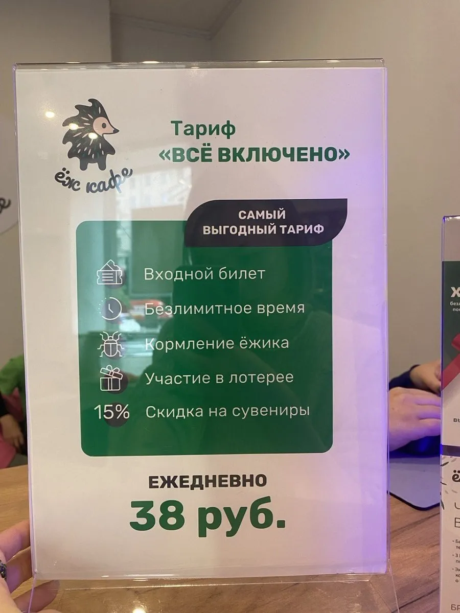 Наши впечатления:Мы получили большое удовольствие от общения с колючими, но очаровательными животными. Мы были поражены разнообразием окрасов и размеров ежиков, которые живут в уютных террариумах. Мы с удовольствием наблюдали за их повадками. Мы узнали много интересного о жизни и уходе за ежами от доброжелательных сотрудников кафе. Мы чувствовали себя как в сказке, окруженные этими милыми существами.