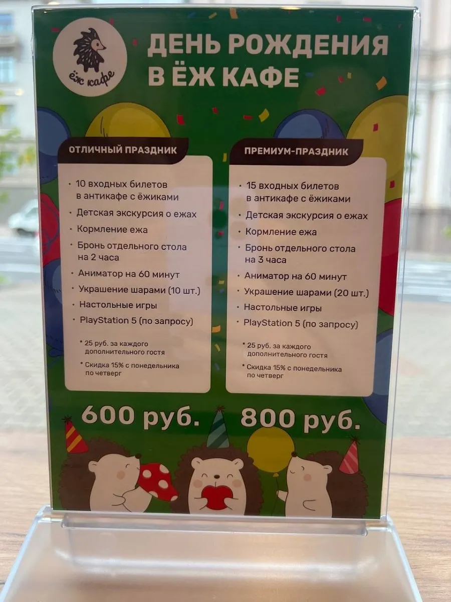• Добавить небольшое меню с легкими закусками, десертами и напитками, которые бы соответствовали тематике ежиков или просто были бы вкусными и свежими. Например, можно было бы предложить пирожные или печенья в форме ежей, фруктовые салаты или смузи из ягод и орехов, кофе или чай.