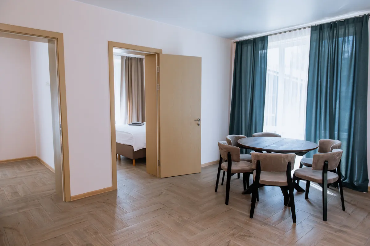 Здесь нет огромных корпусов. Вы живете в одном из 17 отдельных домиков с собственной террасой. Это дает то самое чувство приватности: только вы, лес и тишина. Интерьеры выполнены из натуральных материалов — дышится легко, а спится на ортопедических матрасах просто великолепно. И да, мамы, важный пункт: готовить не придется! На территории работает отличный ресторан с европейской и белорусской кухней, где можно устроить и романтический ужин, и семейный обед.