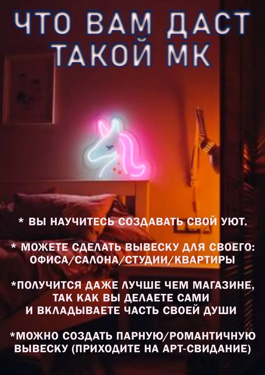 На мастер-классе вы создадите неоновую вывеску для дома или офиса с индивидуальным дизайном, выберете цвет, а готовое изделие подключите к розетке с подарочным блоком питания.Стоимость: 30-50 см - 150 руб.