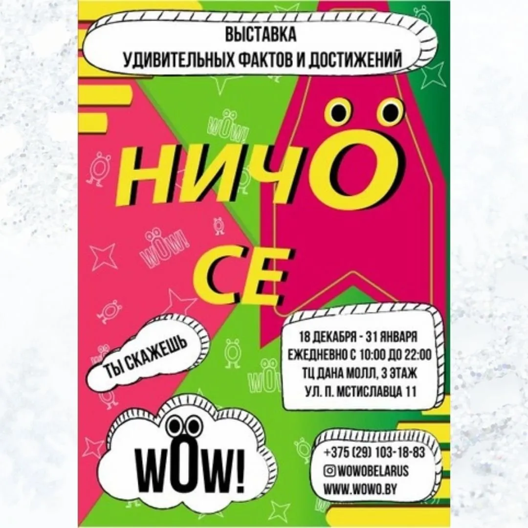 В век всемогущего интернета, кажется, что людей уже трудно удивить диковинками, но выставка интересных фактов «НИЧОсе» докажет обратное и поразит даже скептиков, ведь не каждый день удается увидеть в одном месте компанию рекордсменов – самого большого, высокого и низкого человека на планете, сыграть мелодию на овощах, а также поучаствовать в постановке рекорда Гинесса по созданию самого большого панно автопортретов в мире, в котором примут участие более 10000 человек.