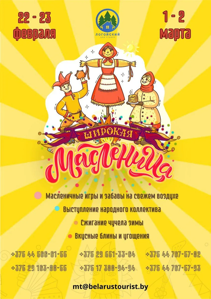 22-23 февраля и 1-2 марта 2025 года Дом отдыха «Логойский» приглашает всех на весёлые масленичные гуляния! Вас ждёт насыщенная программа с народными забавами, играми, выступлениями и, конечно же, праздничным угощением.