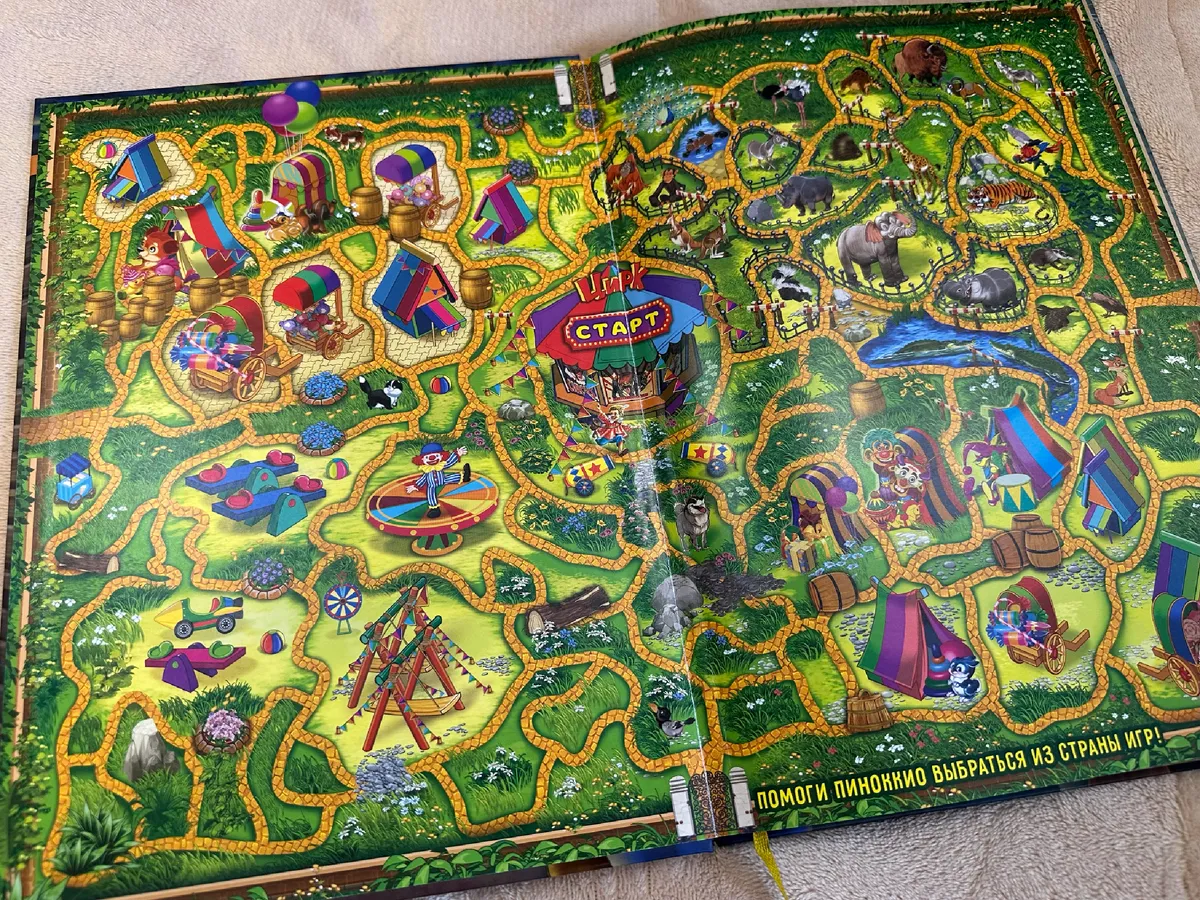 Но уникальность книги не ограничивается только качеством исполнения. Особый восторг у читателей вызывают интерактивные элементы: увлекательный лабиринт и настольная игра, созданные по сюжету книги. Лабиринт предлагает маленьким читателям помочь Пиноккио выбраться из Страны Развлечений, а настольная игра ставит перед ними амбициозную цель – превратиться из деревянного человечка в настоящего мальчика. Эти элементы не только усиливают удовольствие от чтения, но и помогают глубже погрузиться в мир сказки, делая процесс обучения и развития еще более захватывающим.