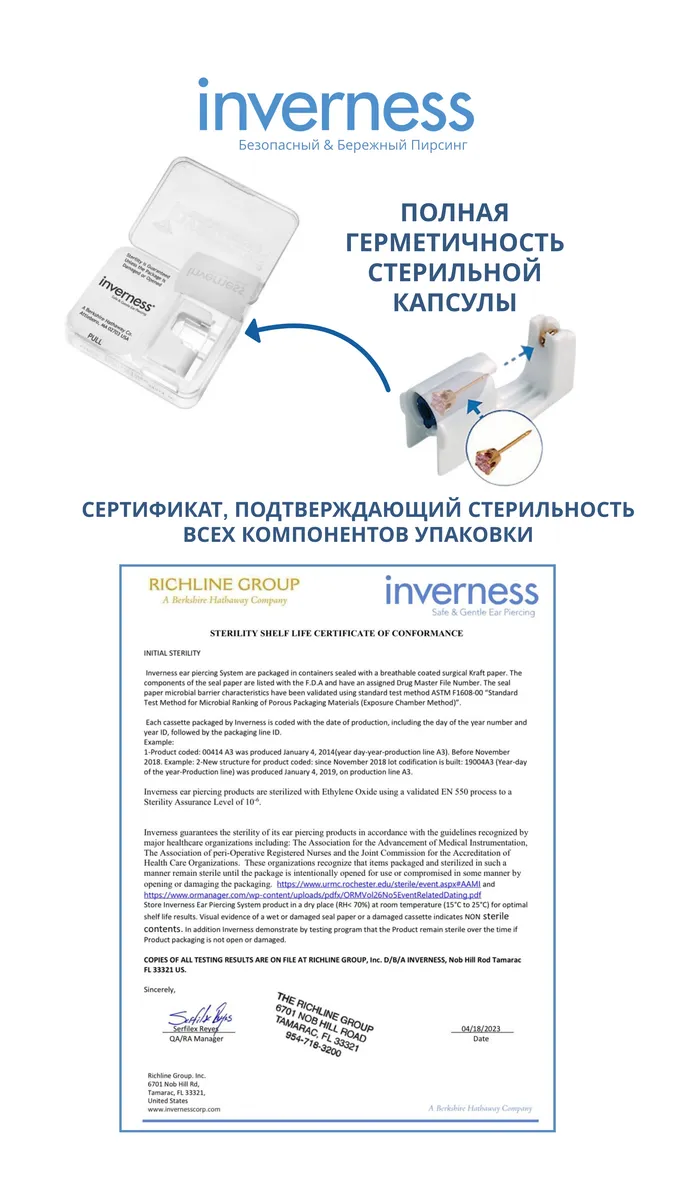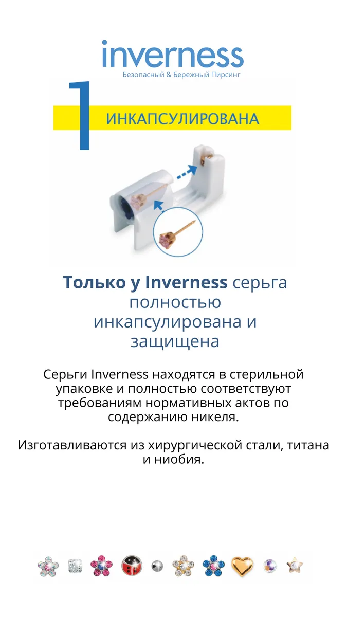 Inverness — это единственная система в мире, где серьга полностью инкапсулирована.Что это значит? Каждая серьга находится в индивидуальной герметичной стерильной капсуле. Она вскрывается непосредственно в момент прокола. Ни руки специалиста, ни сам инструмент никогда не контактируют с сережкой. Это исключает контакт с внешней средой и гарантирует абсолютную стерильность.