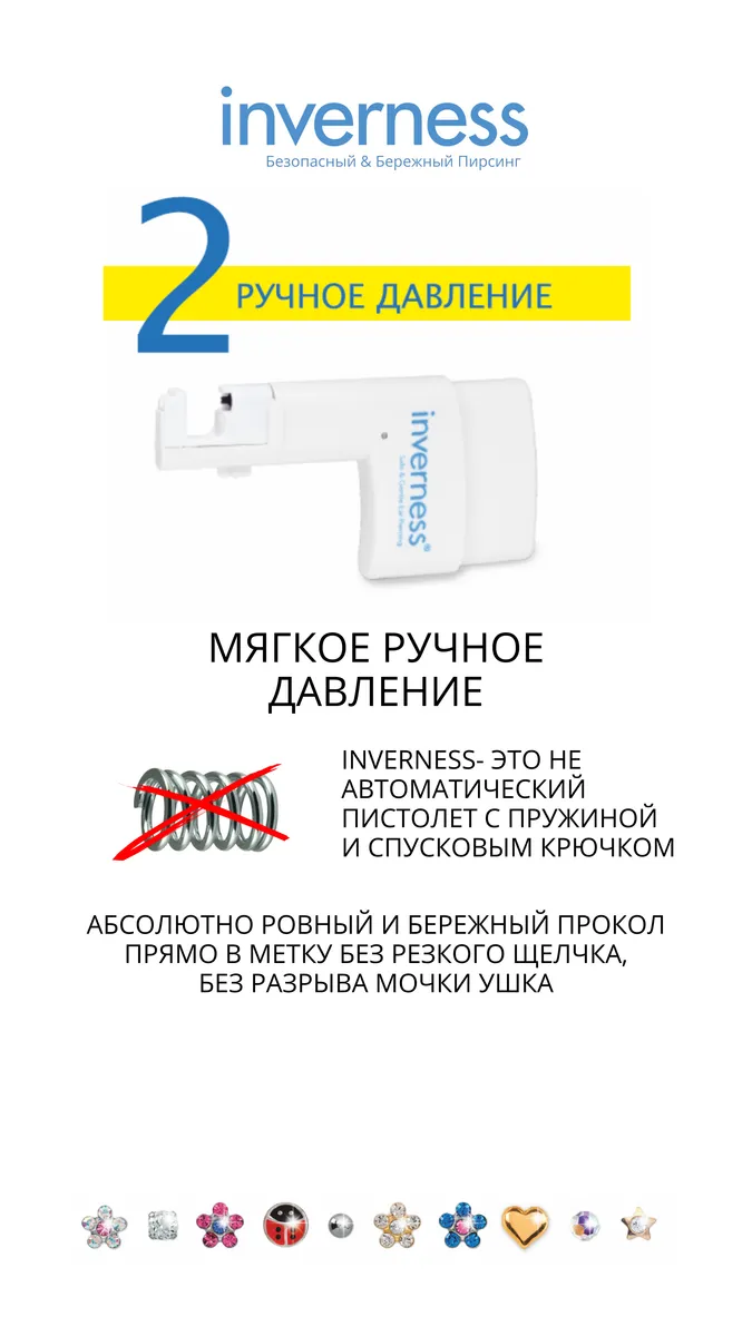Главная причина детских слез при проколе ушей — это часто не сама боль, а испуг от резкого звука. Классический «пистолет» работает жестко: происходит громкий щелчок прямо над ухом. Ребенок вздрагивает, пугается, и на второе ушко его уговорить сложно.Решение от Inverness: