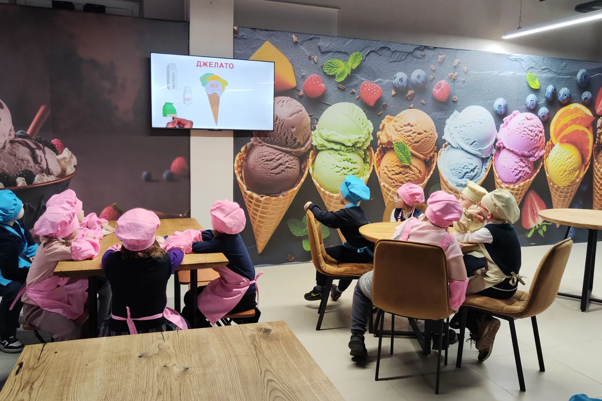 Для начала всем детям показали увлекательный фильм об истории мороженого. Честно говоря, даже взрослый человек не знает всех интересных фактов, связанных с появлением этого лакомства.