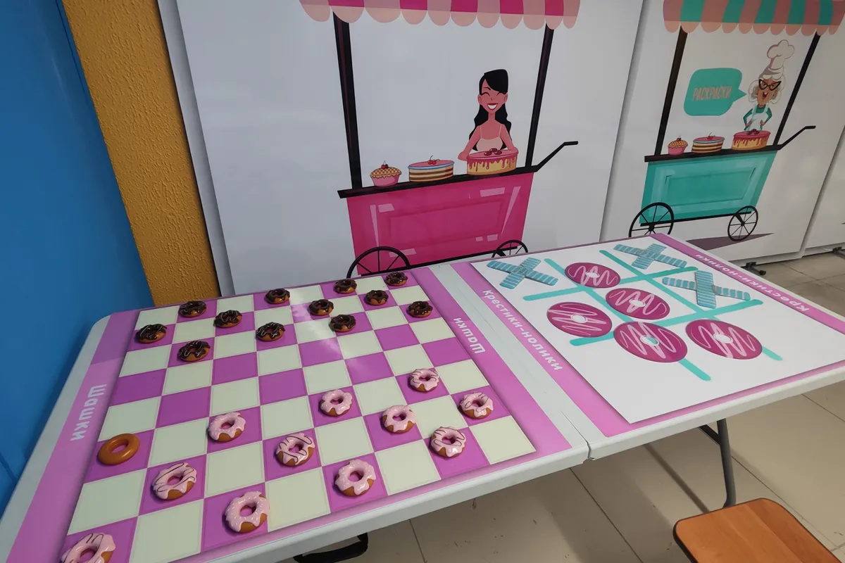 Ну, а после творческого процесса самое время развлечься! И тут как нельзя кстати пришлась игровая зона и фотозона с большими сладкими объемными фигурами!