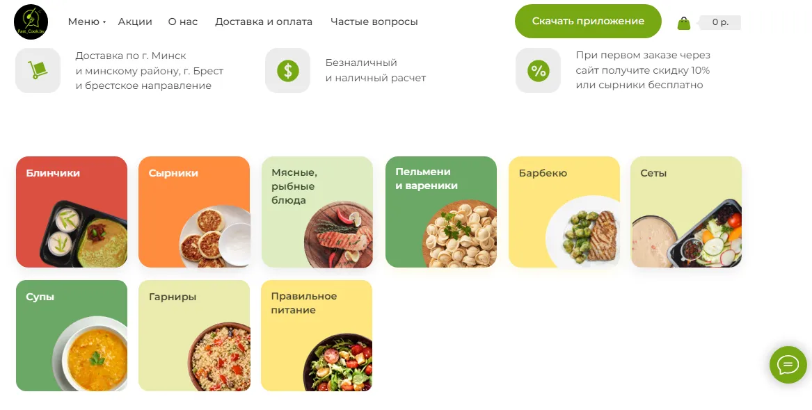 При первом заказе от 70 рублей вы получите скидку 10% или сырники бесплатно. Также, скидка в размере 10% предоставляется на сеты «Fast Cook», а при оформлении первого заказа через приложение, вы получите блинчики в подарок, плюс кэшбэк в размере 5 % за каждый последующий заказ.