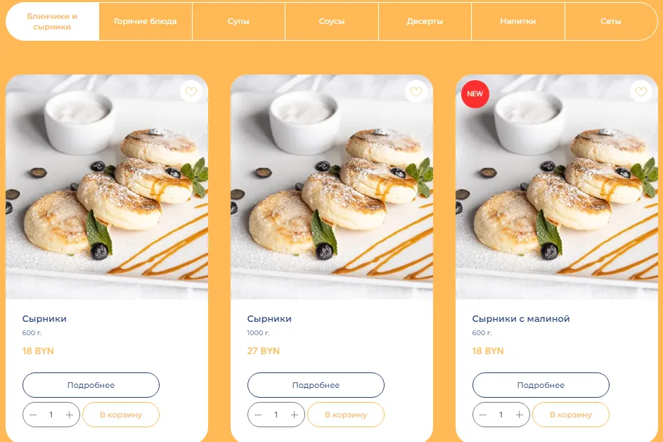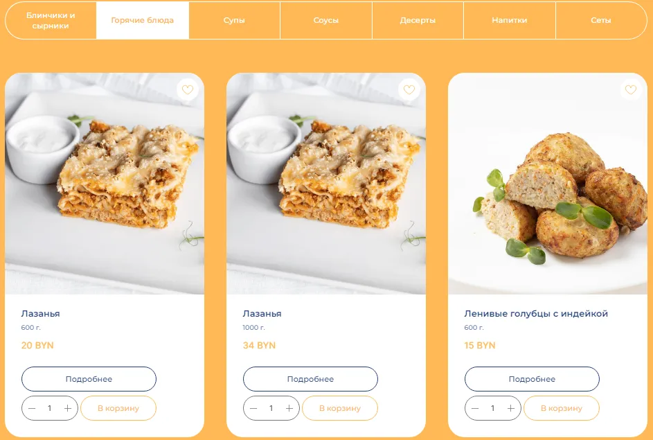 Здесь вы можете заказать сырники и тонкие блинчики со всевозможными начинками (как сладкими, так и солёными), горячие блюда (лазанья, котлеты, голубцы, фалафель, вареники и т.д.), всеми любимые супы, вкуснейшие десерты, разнообразные сеты, а также соусы и напитки.