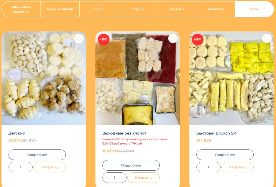 Среди богатого ассортимента компании вы найдёте тонкие блинчики с различными начинками, всевозможные виды сырников, различные мясные и рыбные блюда (включая котлеты, тефтели, лазанью, голубцы и т.д.), пельмени, вареники и чебуреки, полуфабрикаты для шашлыка и барбекю, сеты на любой вкус, супы, которые понравятся всем, гарниры и диетические ПП полуфабрикаты.