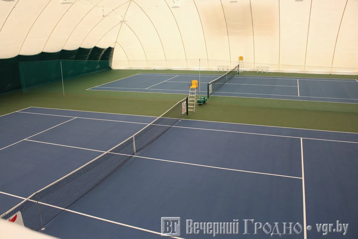 Под куполом кроме кортов разместилось административное здание с методическими кабинетами и раздевалками. А на крыше здания сделали удобную смотровую площадку. Оттуда зрители смогут наблюдать за матчами. Спортивный комплекс появился при поддержке гродненских властей и Белорусской теннисной федерации, которая предоставила современное покрытие кортов.