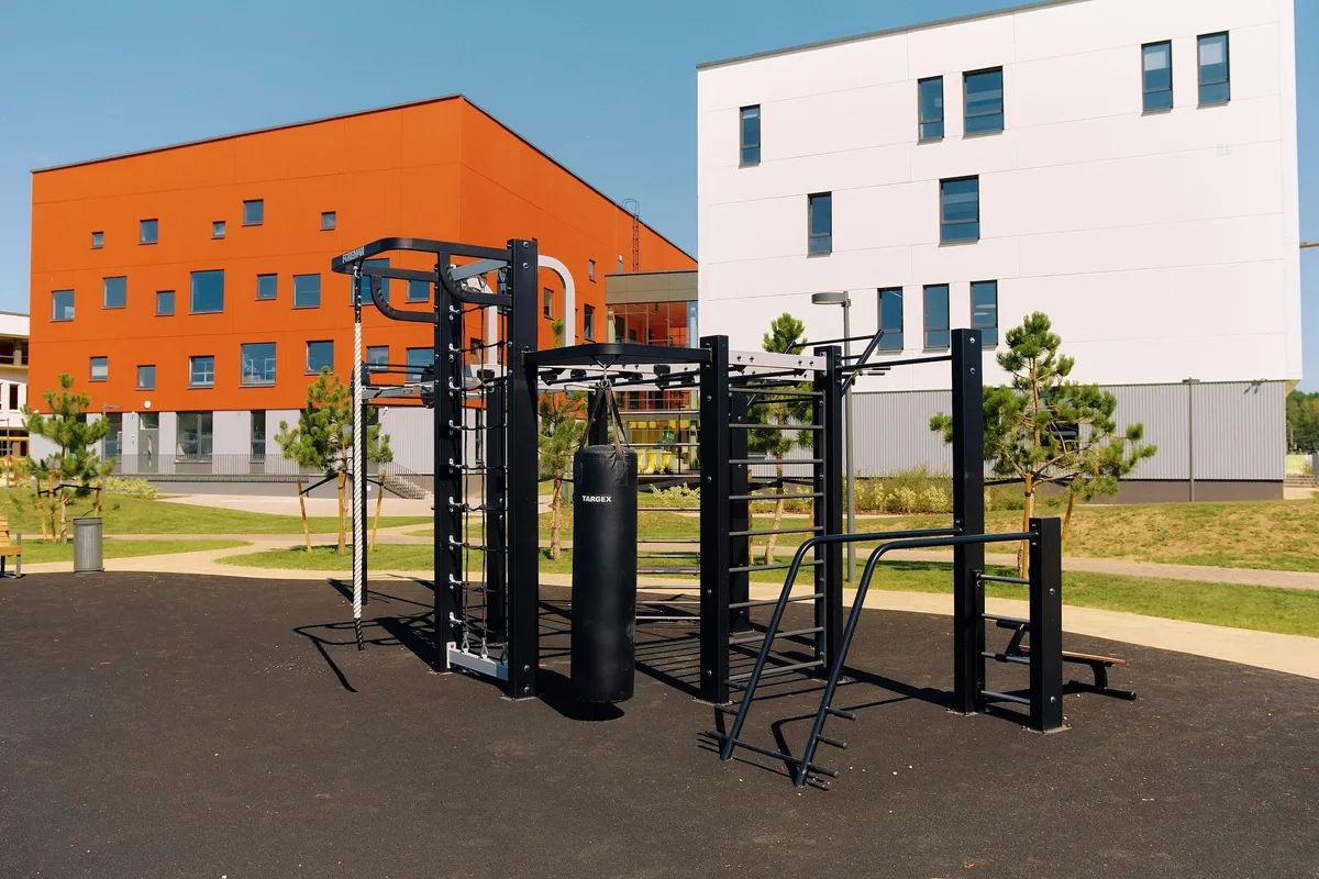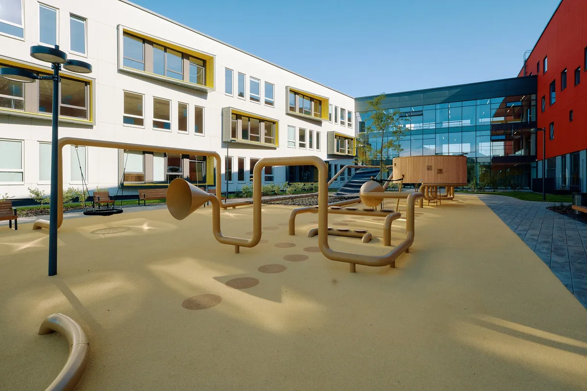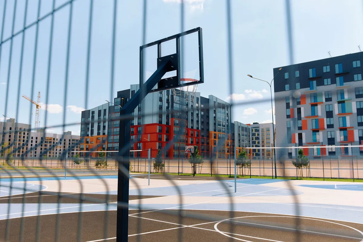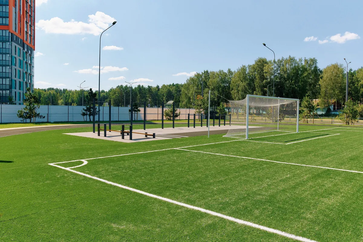 Во дворе организована большая детская площадка с веревочным комплексом, музыкальными инструментами и качелями. Для спорта – большой стадион с искусственным покрытием, воркаут-зона, площадки для баскетбола, волейбола и мини-футбола. Из необычного – памп-треки для велосипедов, самокатов и скейтов разной сложности. Можно отдохнуть и в тишине: на площадке с большими гамаками и переносными стульями.