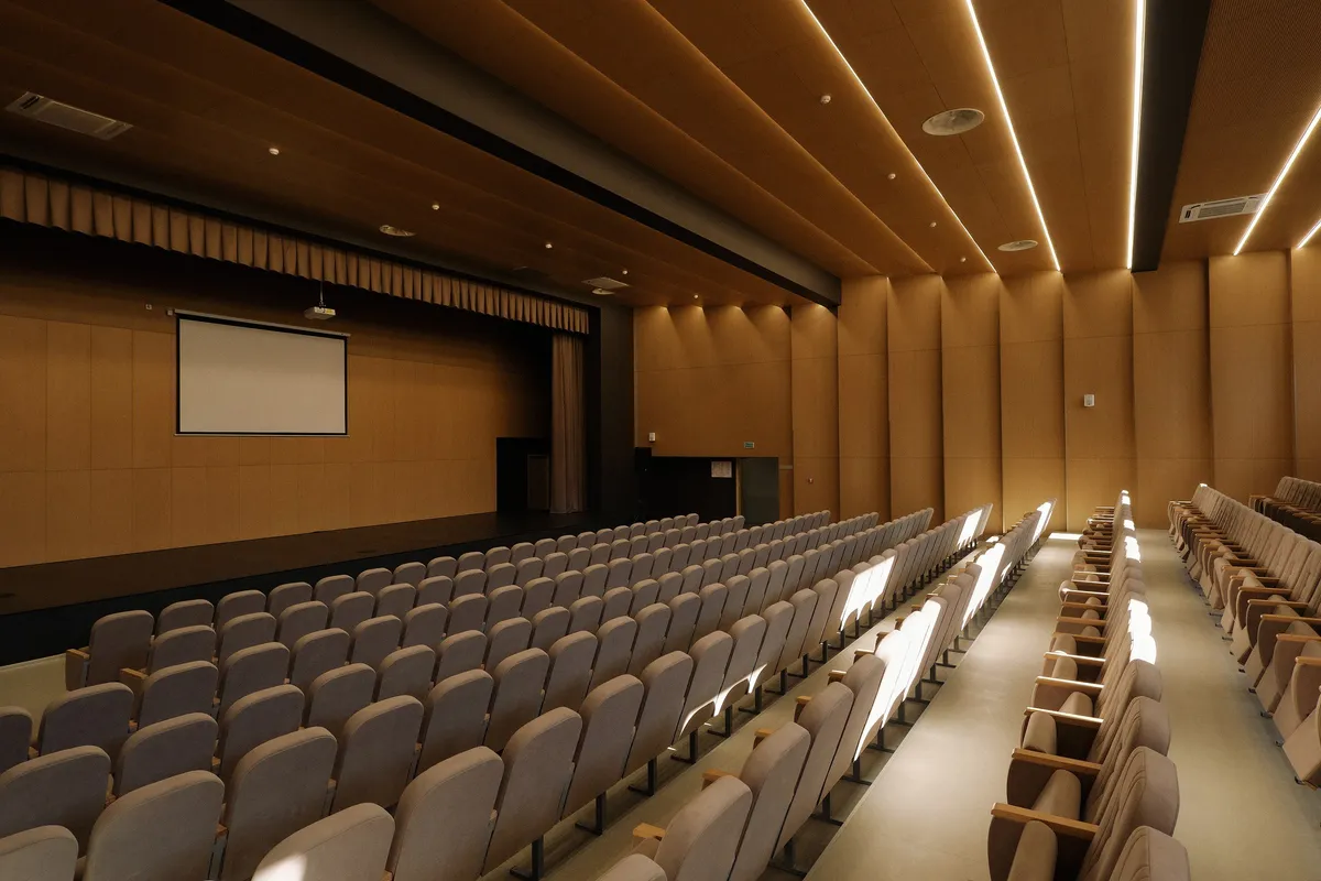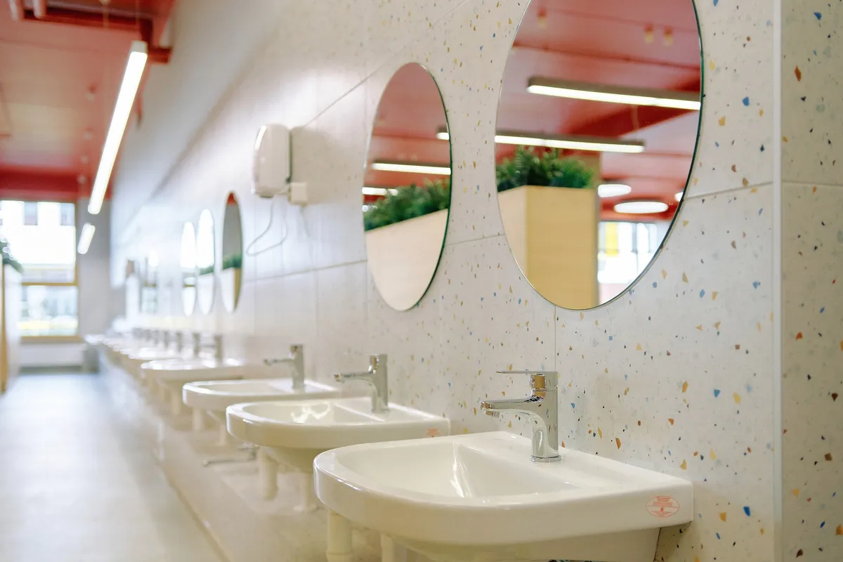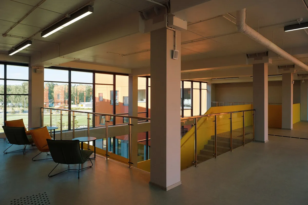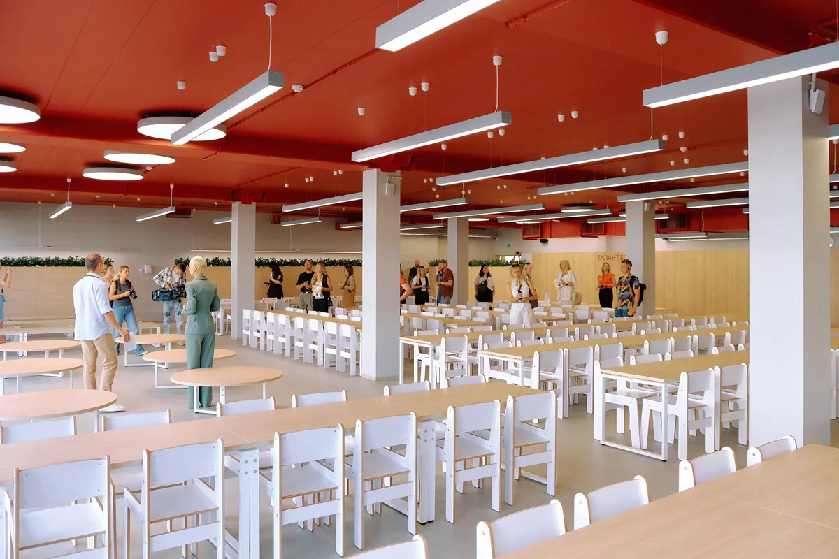 В школе присутствуют малый и большой спортзал с трибунами. А еще – просторная библиотека и актовый зал. Столовая выполнена в виде городского бистро. Интересная деталь: в администрацию ведут прозрачные двери, чтобы устранить барьер между учителем и учеником.