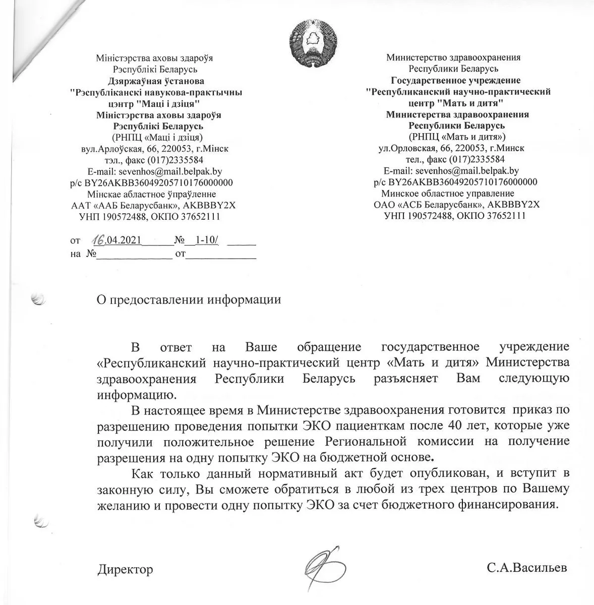Как стало известно, внутренний приказ принят и вступил в силу. При звонке в министерство отвечают, что документ уже разослали во все учреждения здравоохранения, а процедура закупки медпрепаратов на стадии завершения. Это значит, что скоро в Беларуси начнут проводить ЭКО на бюджетной основе.